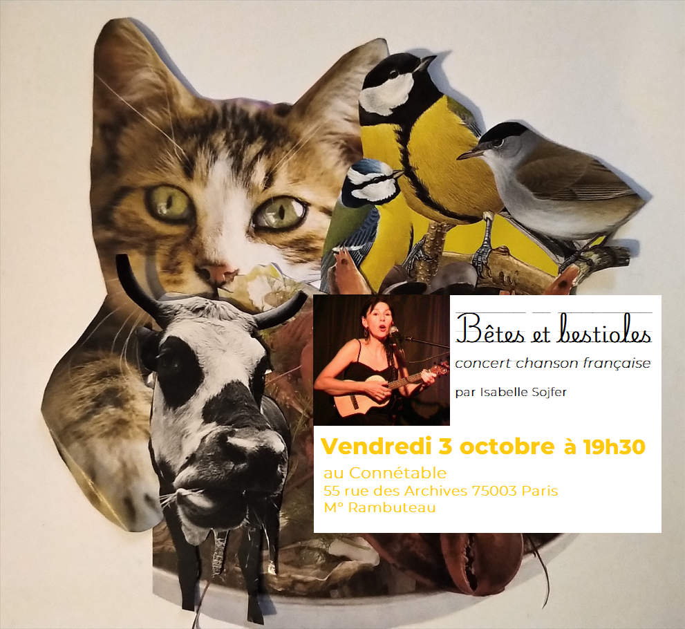 Vendredi 3 octobre à 19h30 – Bêtes et bestioles, Le Connétable, 55 rue des Archives 75003 Paris – M° RambuteauSamedi 6 septembre à 19h30, Des chansons qui se mangent – Le Connétable, 55 rue des Archives 75003 Paris – M° RambuteauSamedi 19 juillet à 20 heures – Le cinéma en chansons à La Note épicée, 13600 La CiotatSamedi 5 juillet à 19h30 – Qu’est-ce qu’on attend pour être heureux – Le Connétable, 55 rue des Archives 75003 Paris – M° RambuteauVendredi 13 juin à 19h30, Chansons contre la guerre et pour la liberté – Le Connétable, 55 rue des Archives 75003 Paris – M° RambuteauVendredi 6 juin à 20 h, Chansons saignantes – Le Cri du singe, 47 rue Marceau Montreuil M° Robespierre.Vendredi 18 avril à 19h30, Le cinéma en chansons – Le Connétable, 55 rue des Archives 75003 Paris – M° Rambuteau Veuillez laisser ce champ vide Newsletter (6 à 8 fois par an) Vérifiez votre boite de réception ou votre répertoire d’indésirables pour confirmer votre abonnement.